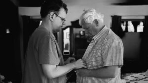 Dad here. Big Dude is a perpetual three-year-old but many times we see him mature and show a different side of himself that makes Mom and me scratch our heads and ask rhetorically, “Where did that come from?” One such ritual is Big Dude’s insistence that I am fully dressed for the day from the moment we greet each other. Big Dude picks out my shirt. There are several that are his favorites. He chooses my trousers, shoes, and socks. If I am standing he will often push me gently…
